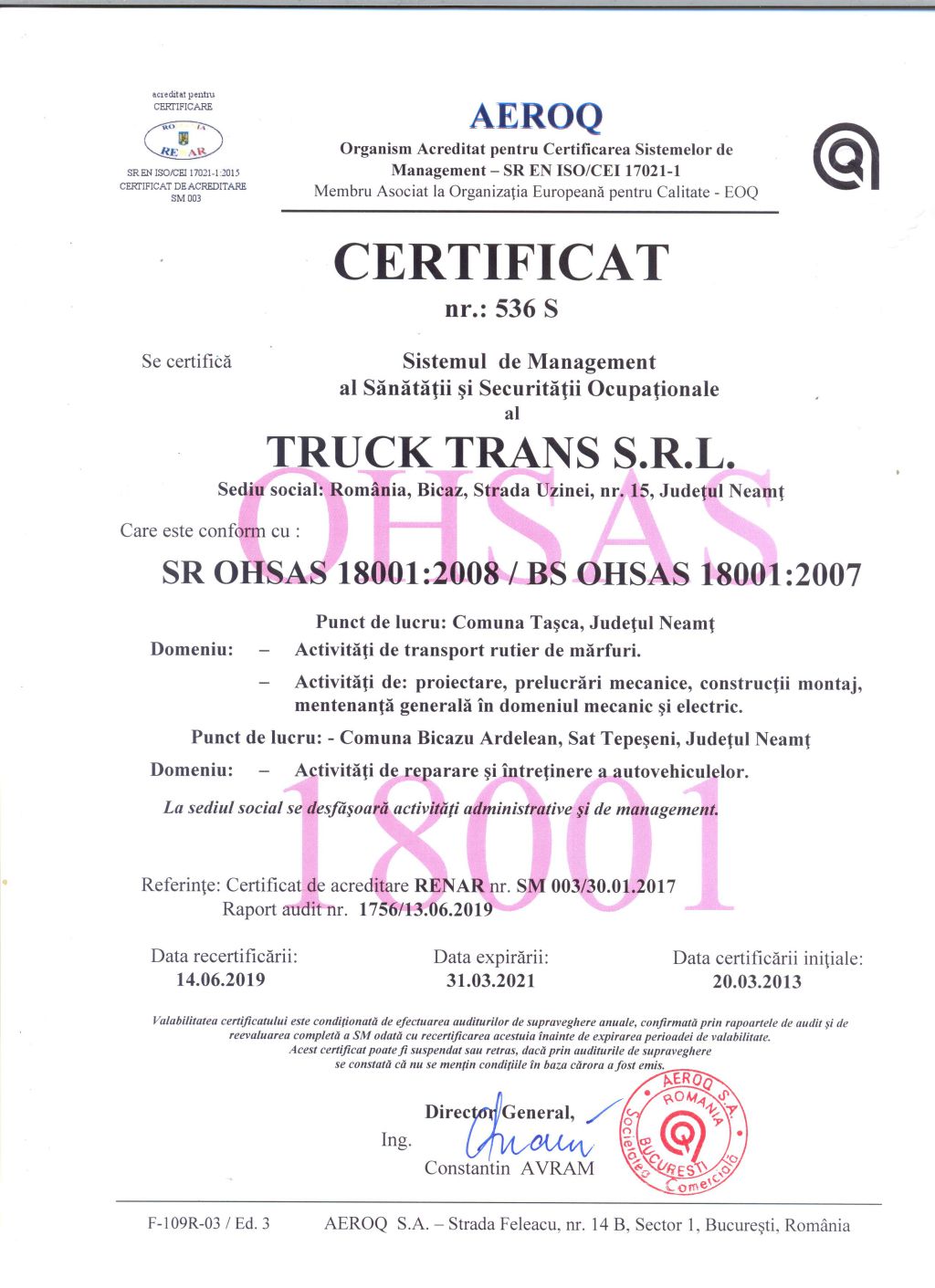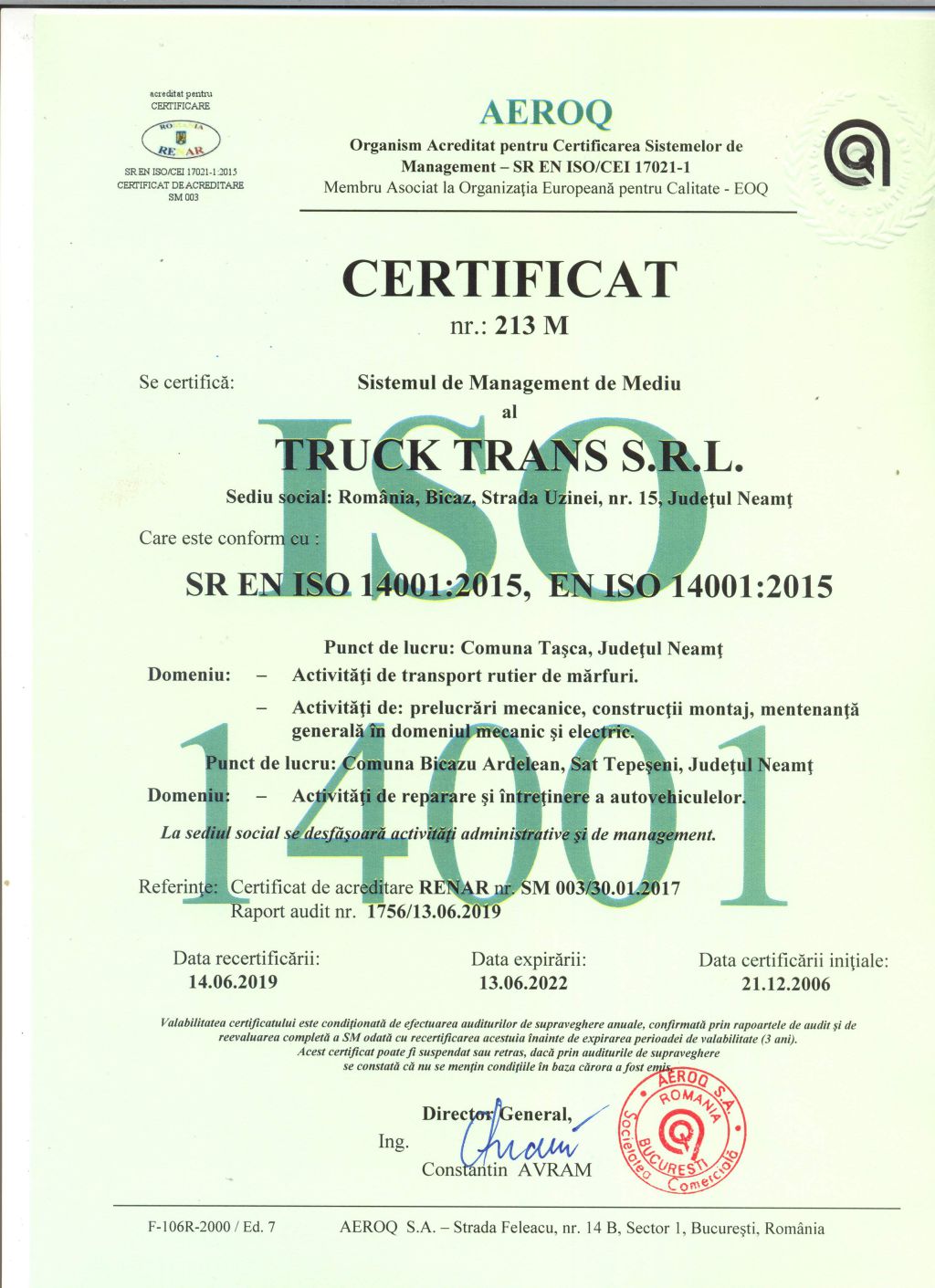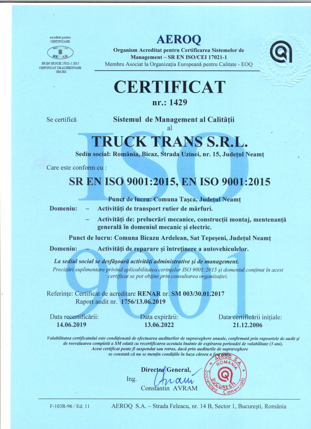 S.C. Truck Trans SRL a implementat, intretine si imbunatateste continuu un sistem de management al calitatii in toate domeniile, in concordanta cu cerintele standardului international EN ISO 9001:2008, certificat de organismul de certificare AEROQ. Deasemenea, compania a obtinut certificarea in domeniul sistemului integrat de calitate - mediu, in concordanta cu cerintele standardului international SR EN ISO 9001:2008, 14001:2005 si 18001:2008 certificat de organismul de certificare AEROQ
